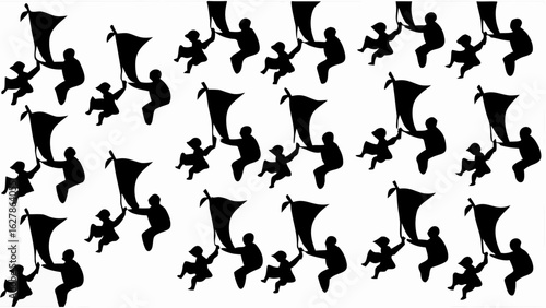 Silhouette pattern of adults and children holding flags in a repeating design across a white background