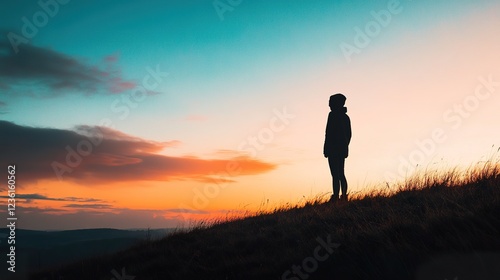 Silhouette Person Sunset Hilltop Landscape Peaceful Evening Meditation