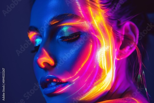 Silhouette profile of an ear illuminated by bright neon lights against a gradient background
