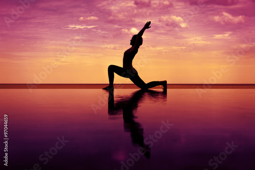 silhouette Reflextion of low lunge in Yoga pose with sunset background