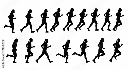 Silhouette sequence showing a woman running through a series of frames on a white background action shot