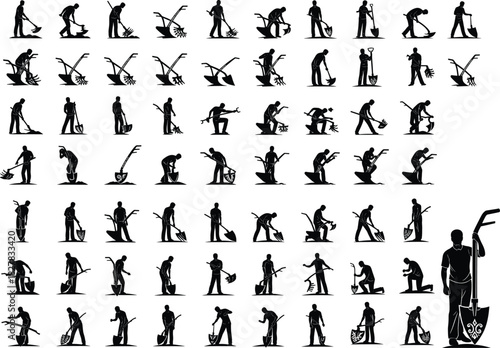"Silhouette Set of Worker with Shovel – Manual Labor Poses Vector"
