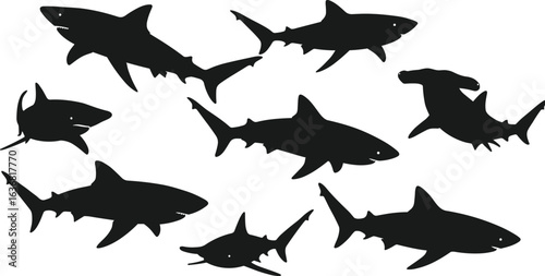 Silhouette shark collection, various shark species vector illustration, black marine predator shapes, ocean wildlife design for decoration and art