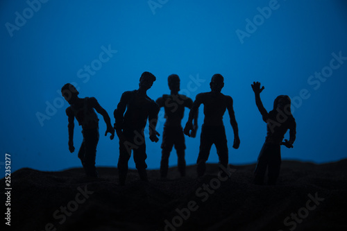 Silhouette some zombies on the cemetery walking around at sunset. Selective focus