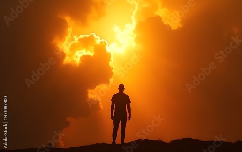 Silhouette stands amidst fiery clouds; golden light above. Ethereal glow and intense atmosphere. High quality