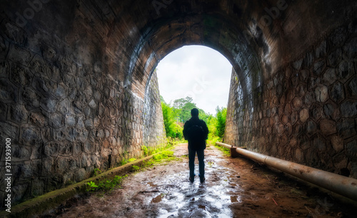 Silhouette traveler man explored in the ancient railway tunnel, abandoned 19th century architecture to today near Da Lat, Vietnam