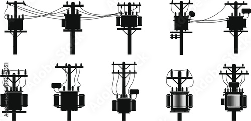 Silhouette vector illustration of electrical transformers on utility poles and towers—power grid infrastructure, voltage system, energy distribution network layout