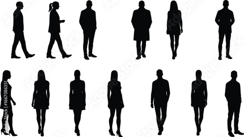 Silhouette vector illustration of walking and standing men and women, front and side views, business and casual poses