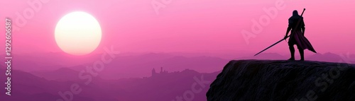 Silhouette Warrior Stands on Cliff Edge Under a Pink Sunset Sky in a Fantasy Landscape World