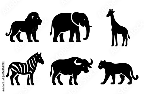 Silhouette wildlife collection: lion, elephant, giraffe, zebra, buffalo, and cheetah