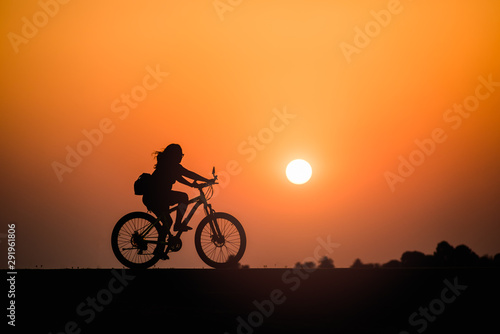 Silhouette woman cycling on sunset background