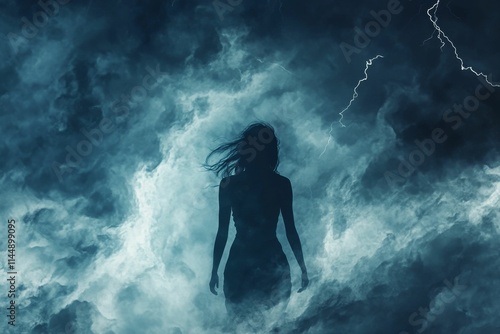 Silhouette woman, stormy clouds, windblown hair, lightning strikes.