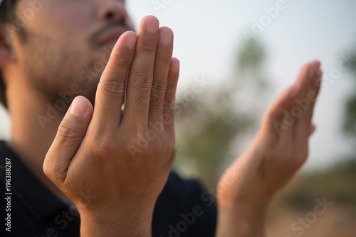 Silhouette Young asian muslim man praying on sunset,Ramadan festival concept