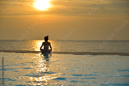 Silhouette young woman practicing yoga on swimming pool and the beach at sunset.