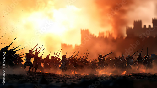 Silhouetted Army Charging Towards Castle Under Dramatic Orange Sunset During Medieval Battle