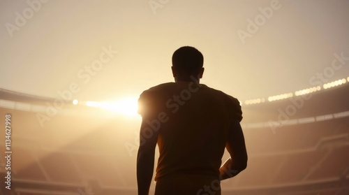 Silhouetted Athlete: A lone athlete stands on the field, gazing out at the stadium lights, a powerful silhouette against the setting sun, symbolizing determination and resilience.