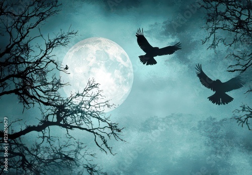 Silhouetted Birds Flying Against a Full Moon in a Misty Night Sky with Leafless Trees and Ethereal Clouds