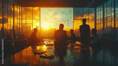 Silhouetted Business Professionals Meeting in Office with Cityscape Sunset View