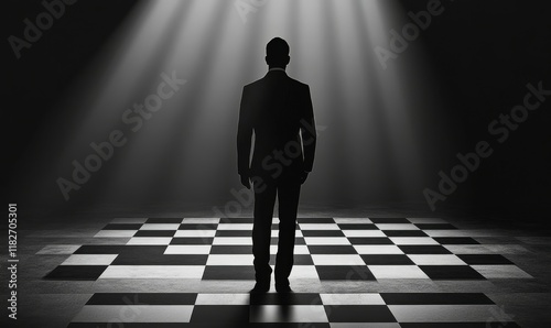 Silhouetted Businessman on Chessboard, Strategic Planning and Leadership