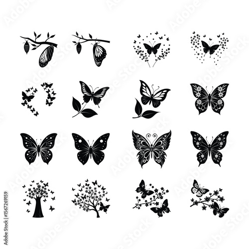 Silhouetted butterflies in various designs some with floral or branch elements arranged in a grid