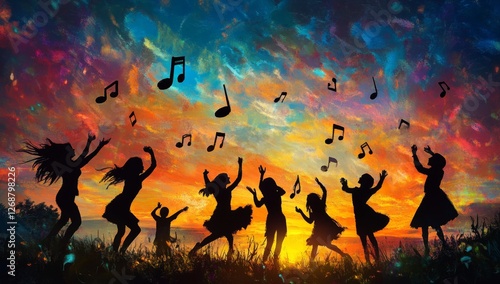 Silhouetted children dancing joyfully at sunset, music notes falling, colorful sky, poster