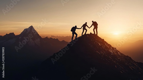 Silhouetted climbers reach the summit at sunset, symbolizing adventure and teamwork.