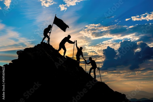 Silhouetted climbers reaching a mountain peak at sunset, symbolizing teamwork and achievement