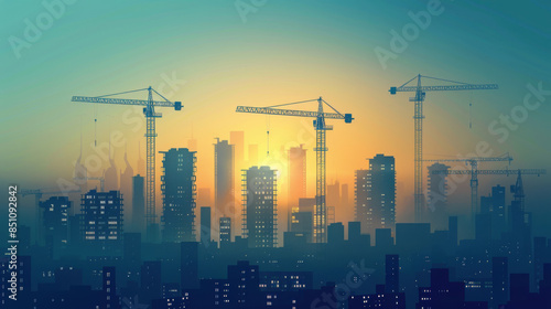 Silhouetted construction cranes towering over a city skyline at sunrise, highlighting urban development and industrial progress.