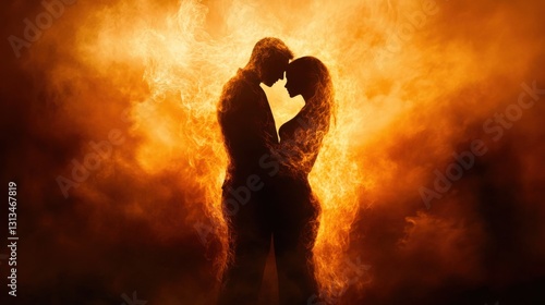 Silhouetted Couple Embracing Amidst Fiery Flames