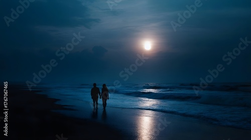 Silhouetted couple holds hands walking on a serene moonlit beach at night
