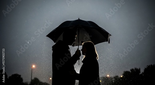 Silhouetted couple stands together under an umbrella in the rain, sharing a romantic moment in the dark.