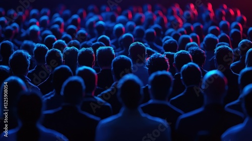 Silhouetted crowd observing event under dramatic red and blue lighting
