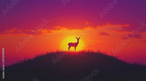 Silhouetted Deer Against Vibrant Sunset Over Rolling Hillside