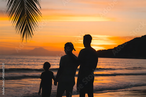 Silhouetted family of three parents and child holding hands watching a vibrant sunset over the ocean waves