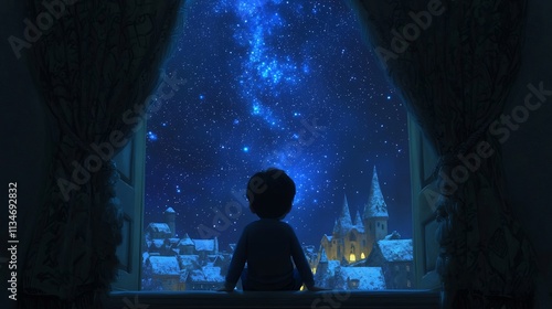 Silhouetted Figure Gazing at the Enchanting Starry Night Sky Over a Majestic Fantasy Castle Landscape