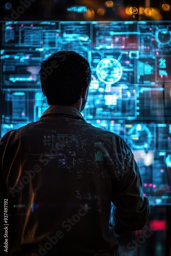 Silhouetted Figure Observing Futuristic Digital Landscape