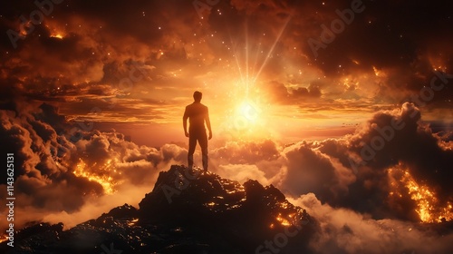 Silhouetted figure standing tall on a mountain peak with a glowing sunrise overhead and radiating light beams spreading outward symbolizing the grandeur of nature