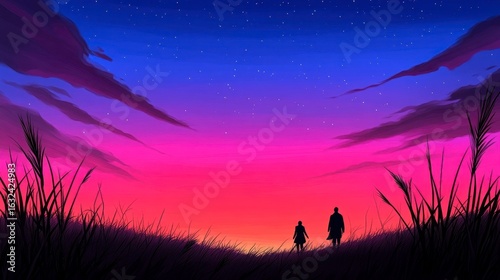 Silhouetted Figures at Sunset Pixel Art Landscape
