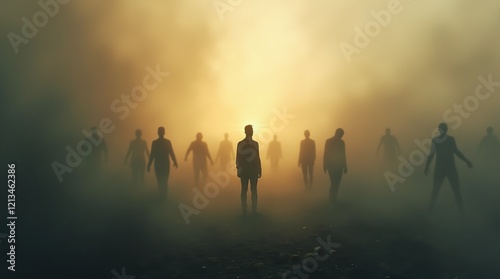 Silhouetted Figures Emerging Mysteriously from Dense Fog at Sunrise