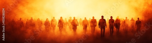 Silhouetted figures in a dramatic orange fog, representing unity and collective strength.