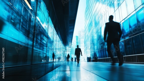 Silhouetted figures walk modern glass building corridor.