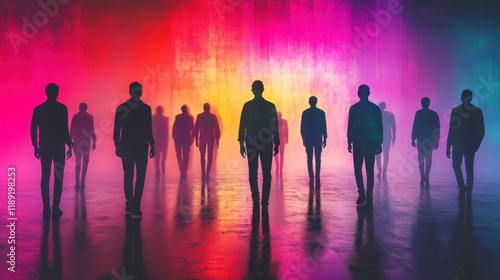 Silhouetted Figures Walking Through a Vibrant Colorful Neon Lit Hallway