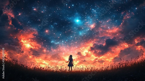 Silhouetted girl gazes at a vibrant celestial panorama.