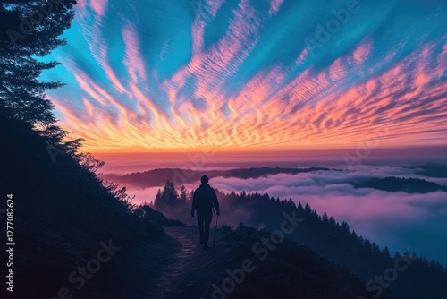 Silhouetted hiker on a mountain trail, witnessing a breathtaking sunrise with vibrant, colorful clouds above a sea of fog.