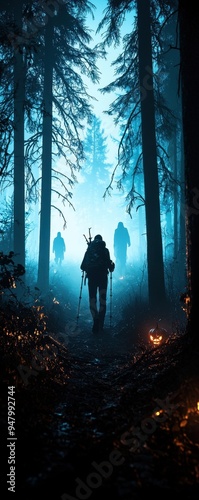 Silhouetted hikers with backpacks and walking sticks trekking through a dense, mystical forest illuminated by soft blue and orange light.