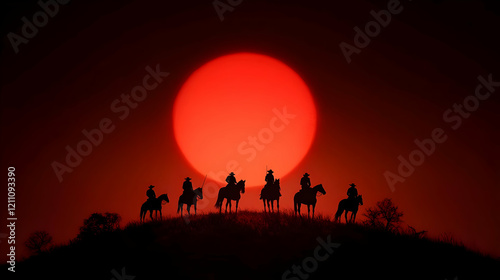 Silhouetted Horse Riders Gather on Hilltop Against a Dramatic Red Sunset Sky.