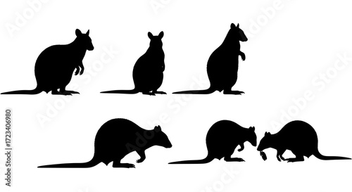 Silhouetted kangaroos isolated on white background showing different positions