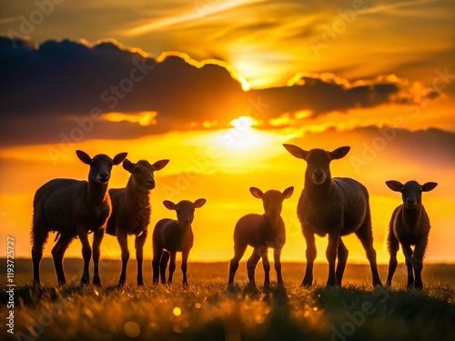 Silhouetted Lambs Grazing in a Sunlit Meadow at Sunset