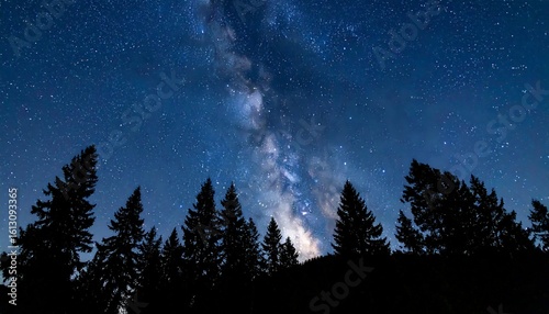 Silhouetted pine trees against a vibrant night sky, showcasing the Milky Way galaxy
