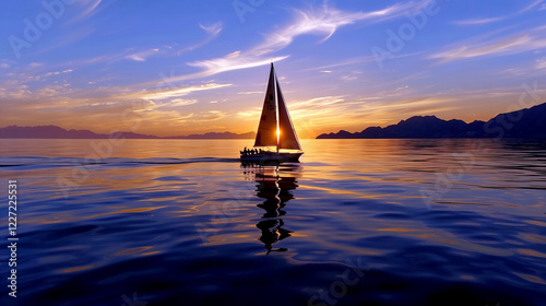 Silhouetted Sailboat at Sunset Over Calm Ocean Waters